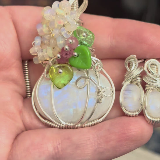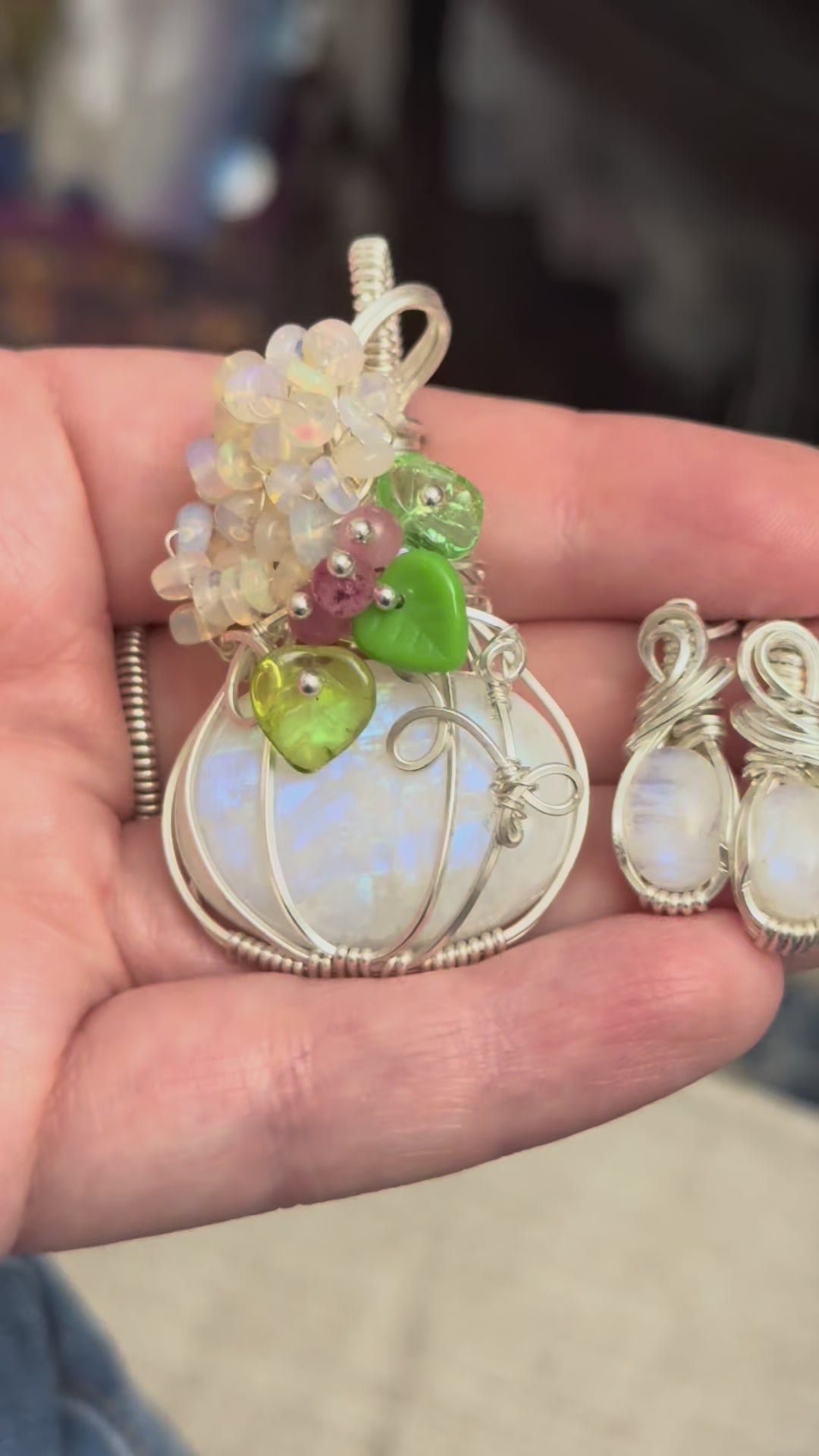 This is a stunning, very flashy Moonstone set as the body of a pumpkin. There are several Ethiopian opal beads as well as some pink tourmaline and varying leaf accents. All of these materials have been contained in .925 Sterling Silver.