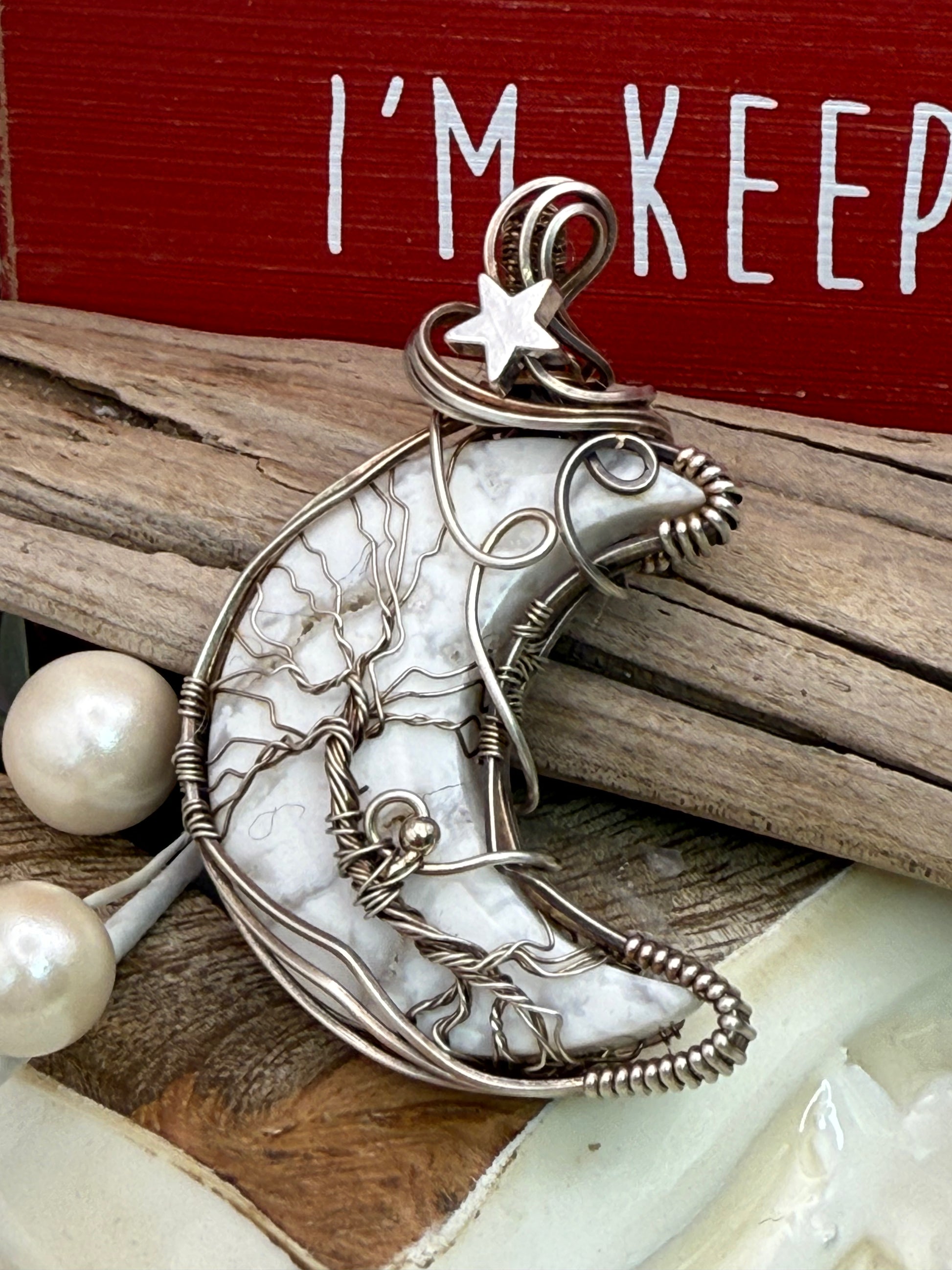 Did you know the Man in The Moon has trees! This white lace druzy agate moon, has a Tree of Life and is among the stars. Wrapped in Sterling Silver, this piece has a sweet touch and can only bring a smile to your face. Perfect for that night out or when you need a bit of whimsy!
