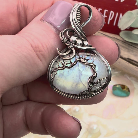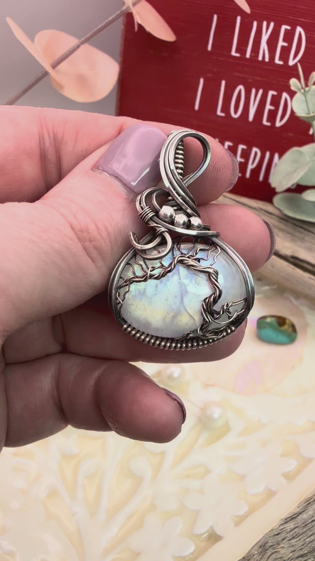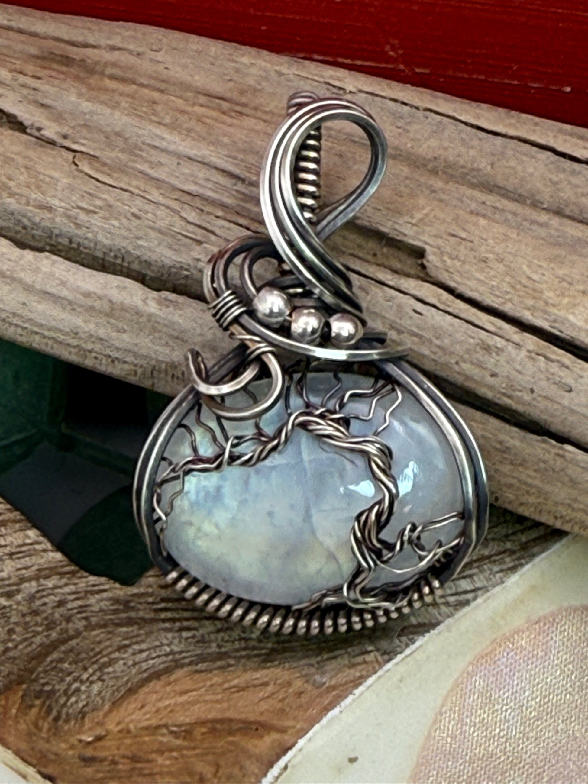 Moonstones are a favorite of many and wrapped with a Tree of Life in Sterling Silver makes them really stand out! The little moon helps to add a touch of whimsy.